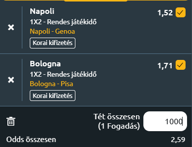 - Napoli – Genoa: A Napoli a hét közepén megszerezte első Bajnokok Ligája-győzelmét 2023 óta, amikor Rasmus Hojlund duplájával legyőzték a Sporting Lisszabont. A bajnokságban a címvédő nagyszerűen kezdte a 2025–26-os idényt, ám a Milan elleni 2-1-es vereség véget vetett a 16 meccses veretlenségi sorozatuknak, így a vezetőedző különösen megkönnyebbült lehetett a lisszaboni siker után. A Napoli hazai pályán idén még veretlen, kilenc győzelem és három döntetlen a mérlegük. A Genoa ezzel szemben a szezon egyik legrosszabb rajtját produkálta: öt mérkőzésen mindössze két pontot gyűjtöttek, és a Lazio elleni 3-0-s hazai vereség után a tabella utolsó előtti helyén állnak. Patrick Vieira együttese a bajnokságban eddig gyenge teljesítményt nyújtott, ráadásul az eddigi eredmények még elődjénél, Gilardinónál is gyengébb képet mutatnak. A formát, a keret minőségét és a közelmúlt eredményeit figyelembe véve a Napoli toronymagas esélyese a találkozónak. Conte csapata otthon veretlen 2025-ben, ráadásul hosszú ideje nem kapott ki a Genoától, amely most gyenge formában, önbizalom nélkül érkezik. A hazaiak friss nemzetközi sikerrel a hátuk mögött, támadóerejüket és rutinos játékosaikat bevetve minden adottsággal rendelkeznek ahhoz, hogy begyűjtsék a három pontot.