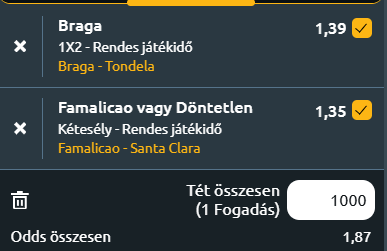 - Famalicao - Santa Clara: A portugál bajnokság első fordulójában a Famalicao hazai pályán, az Estadio Municipal de Famalicao közönsége előtt fogadja a Santa Clara csapatát. A Famalicao 2019–20-as élvonalbeli visszatérése óta stabilan a tabella első felében zár, és a tavalyi hetedik helyezés klubtörténetük második legjobb eredményének számít. A szezon hajrája azonban csalódást keltőre sikerült: a március vége és április eleje közötti három győzelem után az utolsó öt mérkőzésükön csak egyszer tudtak nyerni (egy döntetlen, három vereség), köztük a Santa Clara elleni 2–1-es fiaskóval, amivel duplán is alulmaradtak riválisukkal szemben a múlt idényben. A Santa Clara felkészülését a barátságos mérkőzések és a Konferencia-liga selejtezője együtt formálta. Vasco Matos együttese négy felkészülési meccséből hármat megnyert, majd a nemzetközi porondon is sikerrel szerepelt: a Varazdint idegenbeli hátrányból fordítva, összesítésben 3–2-re múlták felül, a harmadik selejtezőkör első meccsén pedig 3–0-ra legyőzték a Larne csapatát. Bár a Santa Clara kiváló formában zárta az előző idényt, és a nemzetközi kupában is sikeresen kezdett, a köztes hétközi idegenbeli mérkőzés, valamint az utazás terhei érezhetően befolyásolhatják teljesítményüket. A Famalicao hazai pályán, frissebb lábakkal és jó felkészülési eredményekkel várhatja a találkozót, ráadásul motiváltan lép pályára a tavalyi kettős vereség után. Mindezek alapján egy szoros mérkőzésre lehet számítani, ahol a döntetlen mellett a Famalicao minimális különbséggel győzhet.