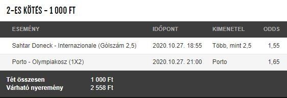 - És elérkeztünk a 2020/2021-es Bajnokok Ligája csoportkörének második fordulójához, amelyet ma és holnap rendeznek. A keddi kínálatból választottam ki két meccset és a tegnapi naphoz hasonlatosan, ez a mai szelvény is egy kövér dupla lett.