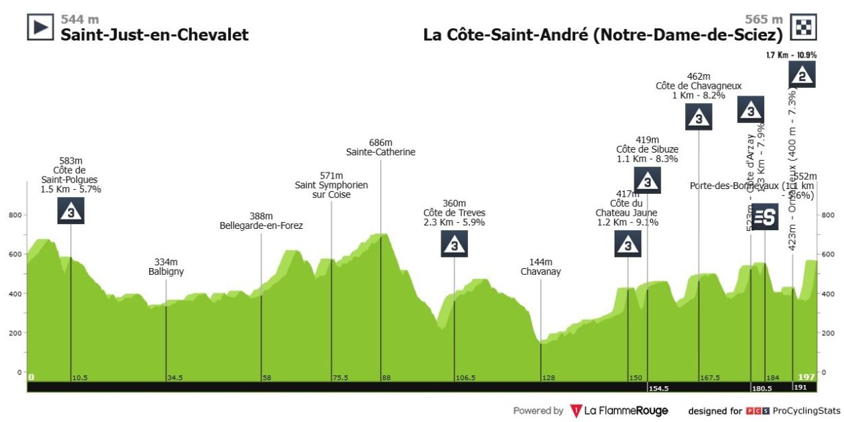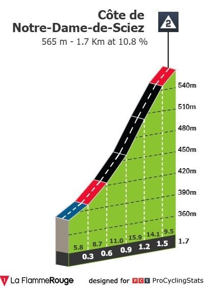 - Az ország közepéről irány kelet, méghozzá a folyók mentén. A Loire és az Isére partjain zajlik ma a szakasz, de mászásokban sem lesz hiány. Hat darab 3. kategóriás színesíti a napot és végül egy izmos 2.kategóriás emelkedőn a befutó. Rövid, de nagyon meredek kaptatók várnak a mezőnyre, ha ránézünk a szintrajzra, nem járunk magasan, de megy a hullámvasút. Az első két mászás a szakasz első felében lesz, 6% alatt nem is tűnnek vészesnek. A nap végén aztán besűrűsödik, az utolsó 55 kilométeren 5 kategorizált emelkedő és még a részhajrás másodpercekért is el lehet menni a cél előtt. Az utolsó 5 emelkedőből négynek van 10+%-os része, de a Cote d'Arzay sem lesz gyenge, mert a második fele végig tartja a 9,7%-os átlagmeredekséget. Minden emelkedőt nem mutatok be részletesen, de a Cote de Notre-Dame de Sciezre vessünk egy pillantást. A legmeredekebb pontja 18%-os.