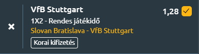 - A Slovan Bratislava nem tudta megugrani a BL-lécet, mind a hat csoportmeccsüket elvesztették, miközben 21 gólt kaptak, és csak ötöt szereztek. Bár néhány meccsen tisztességesen helytálltak, más találkozókon súlyos vereségeket szenvedtek. A hazai bajnokságban ugyan továbbra is dominálnak, 18 forduló után hárompontos előnnyel vezetik a tabellát MSK Zilina előtt. Formájuk erős, hiszen legutóbbi kilenc mérkőzésükből hetet megnyertek, legutóbbi sikerüket a DAC Dunaszerdahely ellen aratták. Szlovákiában nem megy még a bajnokság, ezért nincsenek meccsben. A Stuttgart felemás eredményeket ért el a BL-ben. Hat mérkőzésükből kettőt megnyertek, egyet döntetlenre hoztak, és hármat elveszítettek. A legfigyelemreméltóbb győzelmük a Juventus elleni idegenbeli 1-0 volt, bár ezt követően egy súlyos, 5-1-es vereségbe szaladtak bele a Crvena zvezda ellen. A Bundesliga nagy múltú csapata tavaly a Bundesliga második helyén végzett, idén pedig tovább folytatják jó szereplésüket: jelenleg negyedikek a német bajnokságban. Formájuk remek, hiszen legutóbbi nyolc meccsükből hetet megnyertek, köztük egy magabiztos 4-0-s győzelmet Freiburg ellen. A Slovannak csak a becsületpont lehet a célja, hiszen a továbbjutásról szó sem lehetett egyetlen percig sem, a Stuttgart viszont motiváltan érkezik, hiszen győzelem esetén jó eséllyel továbbjuthatnak a rájátszásba. Nem tudok semmi érvet felhozni a szlovákok sikere mellett.