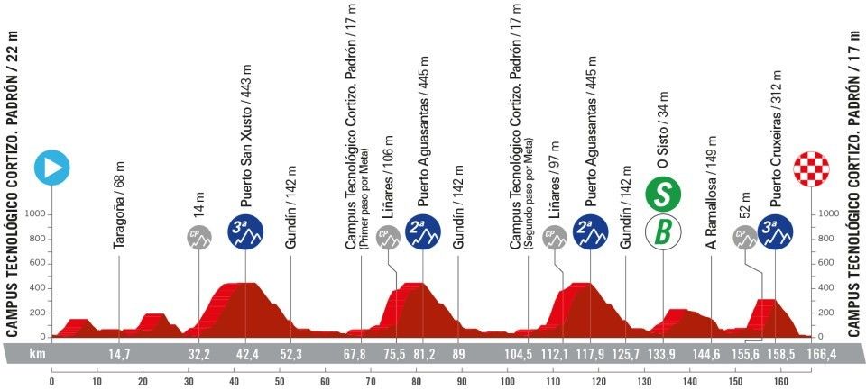 - Emelkedők: A két darab harmadikkategóriás emelkedő közé rakták a kétszeri mászásra "ítélt" Puerto Aguasantast. A Puerto San Xustoval kezdődik a libikóka, 10km hosszan, átlag 4,2%-on, 443 méter magasra mennek. Az említett Aguasantas ennél két méterrel magasabb, mégsincs benn annyi függőleges menés, jóval rövidebb, csak 5,7km, viszont 6,1%, ahogy már írtam, duplán. A napot a Cruxeiras zárja, 310 méter magasra kell felmenni, közel 3km táv, viszont az átlag meredeksége 8,9%. Zárásként le kell jönni a hegyről.