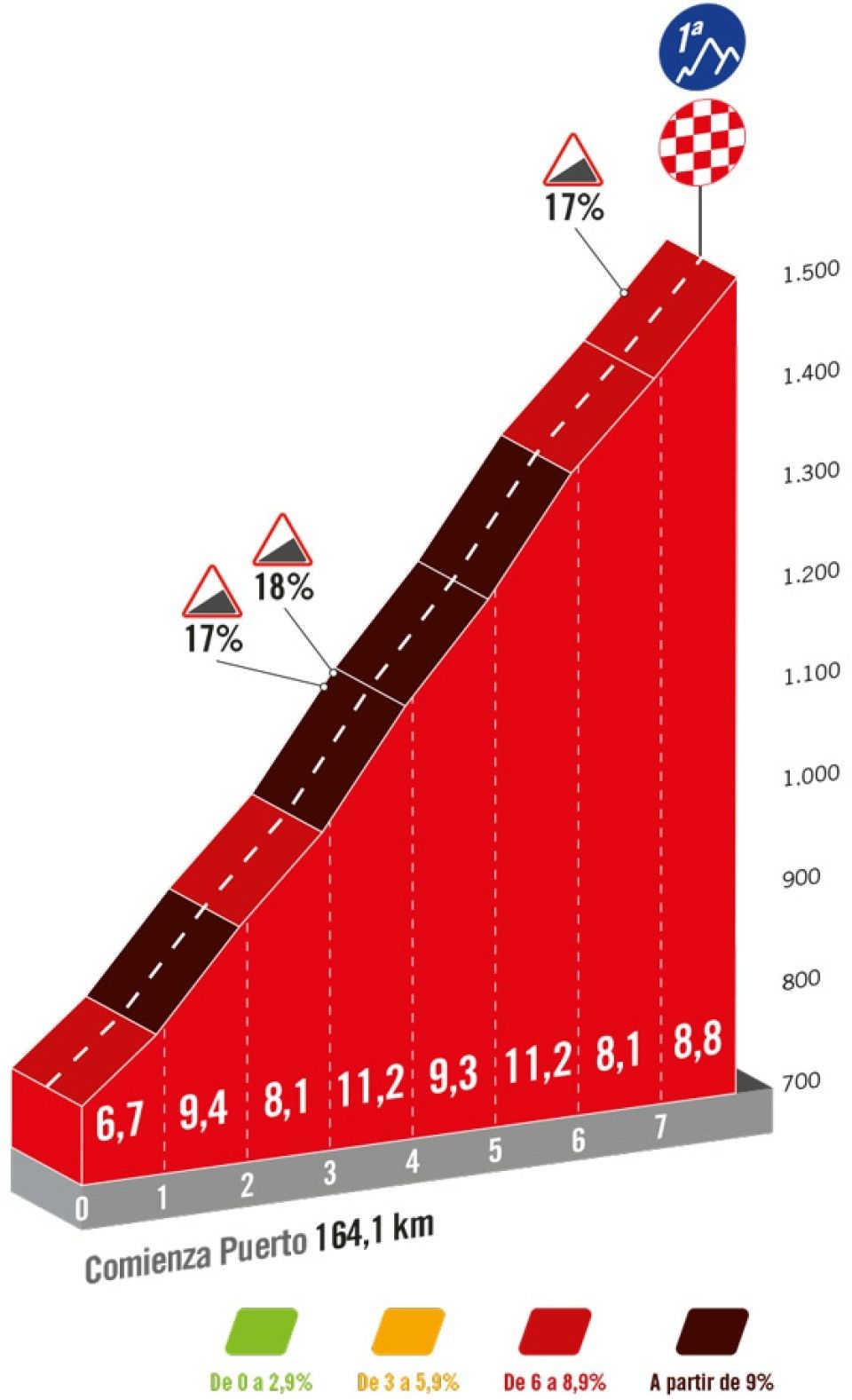 - Puerto de la Braguia: Harmadik kategória, 5,8km, 5,9%, 345 méter szintkülönbség, 700m a csúcs