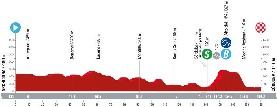 - Emelkedők: Egy kategorizált emelkedővel találkozunk a szakaszon, ez pedig az érdekes nevű, Alto del 14%, második kategóriás. Nem kell magasra menni, viszont 7,4 km hosszú és átlag 5,6%.