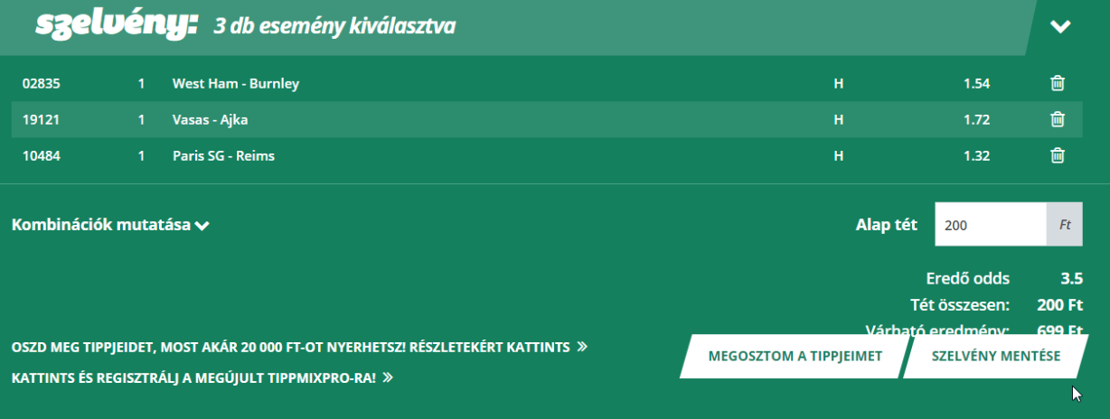 - Miután mindkét reg megvan, indulhat a játék! A feladat egyszerű! A Tippmix kalkulátor segítségével válasszátok ki azt a tippet, amely szerintetek az adott nap legjobb tippje. Amennyiben megvan, a jobb alsó sarokban található zöld alapon fehér nyílra kattintva felgördülő menüpanelen a MEGOSZTOM TIPPJEIMET gombra kattintasz. Ennyi az egész. A képen csak a példa kedvéért van hárommeccses szelvény, bármilyen tipp lehet.