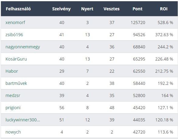 - Az első helyen Xenomorf végzett 40 tippjéből 3 jött le, a többi elment. De ennek a három szelvénynek köszönhetően nem csak a TIppster-versenyt nyerte meg, hanem a különdíjat is, hiszen neki lett a legmagasabb a ROI-ja.